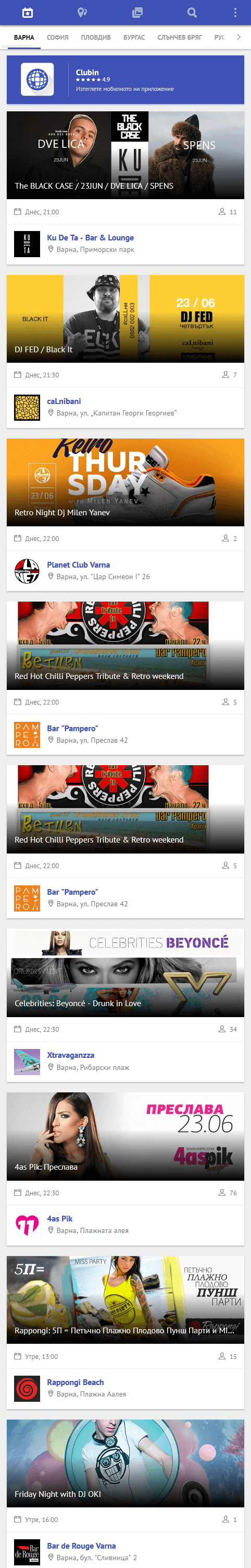 Clubin е уеб базирана платформа, която показва всички предстоящи парти събития от Facebook страниците на нощните заведения. С Clubin Вие научавате за събитията във Вашия град, намирате нови места за забавление и разглеждате снимки от партитата. Към платформата има иградени мобилни приложения за Android и iOS.